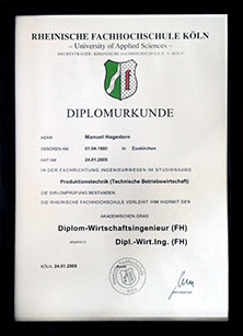Diplomurkunde zum "Diplom-Wirtschaftsingenieur (FH)", Studiengang Produktionstechnik an der Rheinischen Fachhochschule Köln